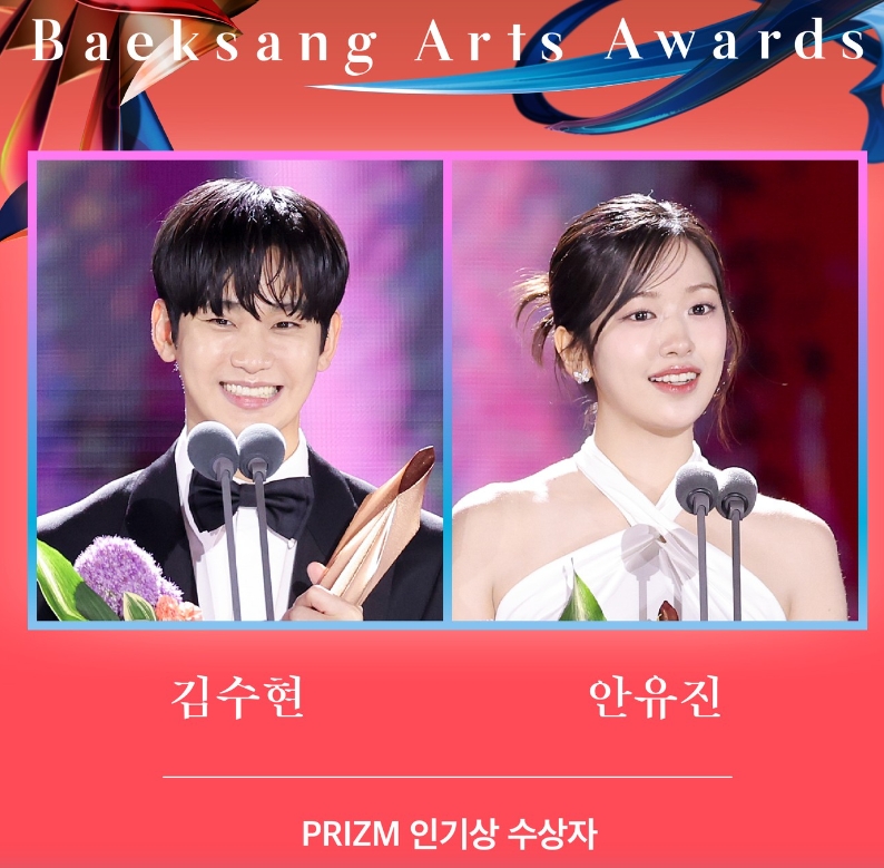 TV부문 예능상에는 나영성 PD, 홍진경배우가 수상을 했고 PRIZM 인기상에는 쟁쟁한 후보들을 물리친 김수현 배우와 안유진 님이 수상을 하였습니다.